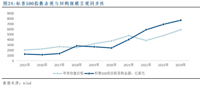 美股上市公司回购规模如此庞大,使得回购已经成为推动美股上涨的关键“助推器”。以标普500指数为例,2015-2024年,十年间标普500指数成份股合计回购金额3.6万亿美元;该指数从2015年初的2,058点持续上涨至2024年末的5,882点。从下图可以看出,标普500指数的上涨走势与成份股的合计回购规模具有一定同步性,成份股上市公司持续回购股票是标普500指数持续攀升的重要推动力之一。此外,早在2012年,标普道琼斯便发布了标普回购指数,该指数的成份股囊括标普500成份股中最近一年回购比例最高的100只股票。多年以来,标普回购指数的涨势明显高于标普500指数。因此,回购是推动美股长牛的“法宝”。