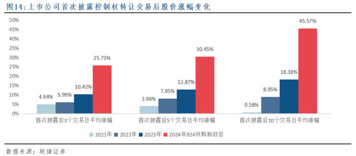 我们以924并购新政后发起的共28起上市公司控制权协议转让交易作为观察重组股热度的样本,分析发现2024年上市公司首次披露控制权变更消息后的3个、5个及10个交易日的平均涨幅为25.73%、30.45%以及45.57%,对照2020-2023年数据,控制权交易对股价的短期刺激程度已发生质变,可以见得并购新政后二级市场对并购重组的热情明显升温。