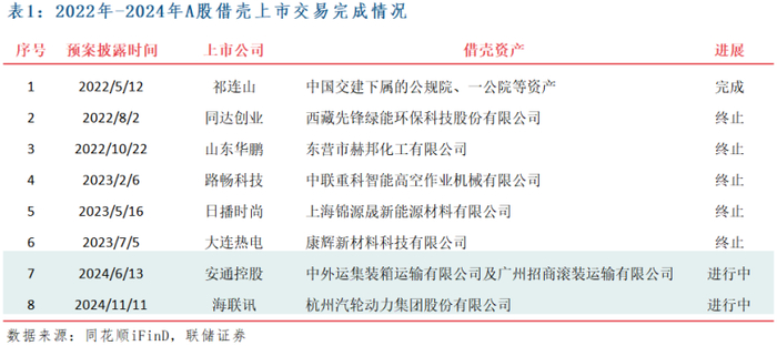 按照《重大资产重组管理办法》之规定,近年来上市公司资产重组构成借壳上市标准的日渐减少,2024年A股市场仅有2家上市公司首次披露借壳上市交易,分别为招商轮船分拆子公司借安通控股上市以及海联讯吸收合并B股杭汽轮。值得注意的是,这两起借壳上市交易均属于同一国资体系内的资源整合,安通控股与招商轮船同属于招商系,海联讯与杭汽轮同属于杭州市国资;由第三方借壳的市场化交易在2024年并未出现。我们回顾了过去两年,即2022-2023年A股市场发起的共6起借壳上市交易,仅有中交设计借壳祁连山这1起交易成功落地,该交易也属于央企重组,剩余5起交易均为市场化借壳,但最终均以失败告终。由此可见,近年来A股市场无一例市场化借壳成功的案例。