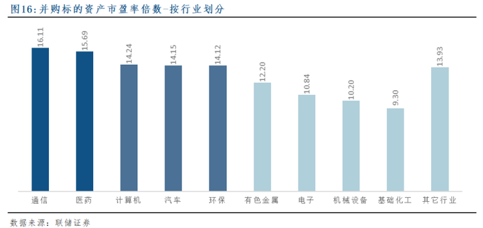 分行业观察,按照科创板和创业板支持的行业为新兴行业,其他行业为传统行业,并剔除两起并购市盈率偏高的交易后对39起重大资产购买进行计算。其中,属于新兴行业的标的资产为19家,静态市盈率均值为13.56倍;属于传统行业的标的资产为20家,静态市盈率均值为12.85倍。因此,无论是收购传统行业资产还是新兴行业资产,并购估值的市盈率水平均是十来倍,估值差异不大。