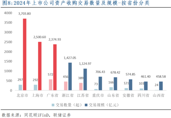 从实施收购资产的上市公司所属地域来看,经济发达的东南沿海地区在收购数量和规模上排名居前。2024年,上市公司资产收购交易数量最多的省份为广东省,合计发起572起交易,合计收购规模约2,375亿元;资产收购交易规模最大的为北京市,交易数量为297起,交易规模超过3,700亿元。