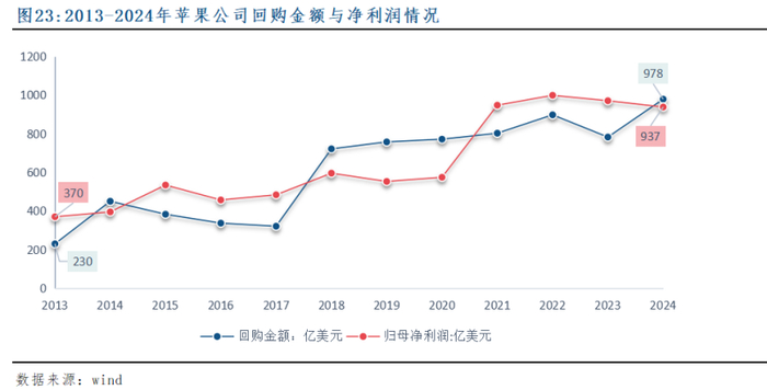 以众所周知的苹果公司为例,公司于1980年上市,在上市后的30年间公司并未启动大规模回购。从2013年开始,苹果公司连续12年进行大规模回购,合计回购金额与其12年创造的净利润之和相当,其中5个年份的回购金额超过了当年净利润。实际上,苹果从回购开启的2013年开始,利润增速中枢就在不断下移,尤其是近年在产品创新及更新迭代上没有大的突破,公司业绩表现不佳且增长乏力。其归母净利润从2013年的370亿美元增长至2024年937亿美元,合计增幅为153%,年复合增长率(CAGR)为8.82%。与其业绩增幅表现不符的是市值不断的大幅增长,苹果公司市值从回购启动前的2013年初的5,000亿美元到2024年末直逼4万亿美元大关,市值涨幅合计高达700%,年复合增长率达20.81%。因此不难判断出,苹果公司市值持续十年的大幅增长主要归功于持续的大规模回购。同时,由于其持续不断的大规模回购,外国机构投资者最看重的选股指标之一——净资产收益率 ROE(摊薄)最高接近200%,而A股最受关注的龙头上市公司贵州茅台ROE(摊薄)最高也才35%。