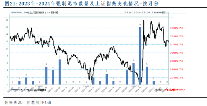 2023年共20家面值退市公司,其中集中在2023年6-8月份退市的有16家,此时间段内上证指数从3,400点附近下挫到3,000点;2024年共38家面值退市公司,其中集中在2024年7-9月份退市的有27家,此时间段内上证指数从3,100点一路下跌至2,700点左右。从以上数据不难发现,在市场整体下跌的背景下,流动性匮乏会加剧股价下跌螺旋,并且投资者在此行情下对低价股倾向于规避,一系列因素都导致面值退市规则在二级市场下行时的加速器效应,难免误伤到一大批企业。