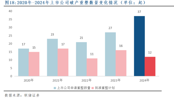 在去年并购报告中,我们曾统计2023年共有27家上市公司向法院申请或被申请重整,申请数量是我国引入破产重整制度有史以来的最高值。而2024年,A股共有37家上市公司向法院申请或被申请重整并发布相关公告,申请数量再创新高。但2024年仅有12家上市公司拿到证监会“路条”,其重整计划得到法院最终批准,重整受理率仅有32.43%,相较2023年的60%有大幅下滑,可见“僧多粥少”,上市公司破产重整难度明显加大。