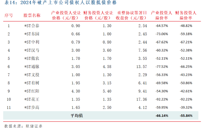 债权人如往年一样以畸高的价格获得上市公司股份,据统计,2024年11家被法院裁定受理重整且已执行完毕的上市公司中,债权人以股抵债的价格较重整协议签署日收盘价的溢价率平均值为114.62%,虽然相较2023年统计的平均值210.23%有大幅下降,但仍然远高于市场价,债权人承担了破产重整的主要风险。
