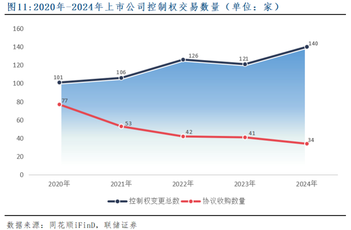 剔除以继承/离婚/家族内部安排、无偿划转、改选董事会等被动方式实现控制权变更的案例后,2024年度A股上市公司共有140家完成控制权变更(以工商登记变更日为统计标准),成为最近5年最高值。回看我们往年对上市公司控制权交易市场的统计并对照分析,我们发现2024年A股控制权交易市场呈现一些新特征。