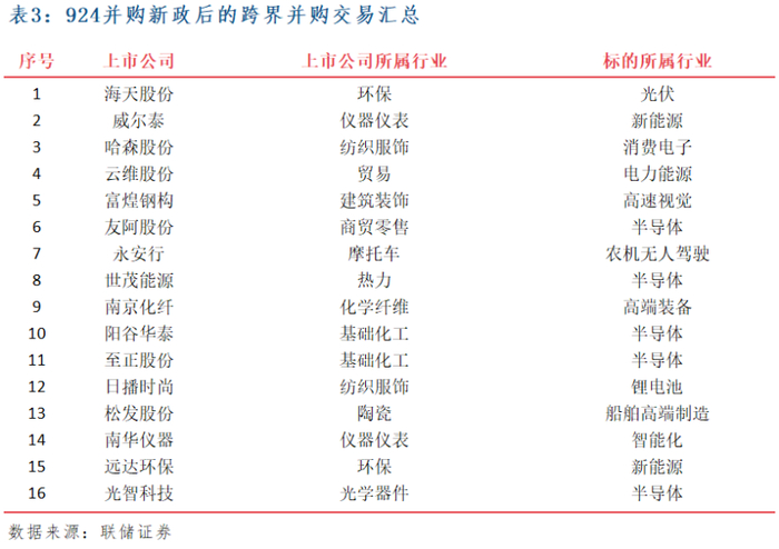 924并购新政颁布后,A股并购市场继续保持着以产业并购为主旋律,上述60起披露重组预案的交易中有44起属于产业并购,占比为73.33%。剩余16起交易系跨界并购,占2024年全年同口径的25起的6成,可见在并购新政的刺激下,上市公司开展跨界并购的步伐有所加快。通过分析标的公司所属行业发现,16起跨界并购都属于新质生产力范畴,半导体、新能源、人工智能等领域的标的成为上市公司转型的“香饽饽”。