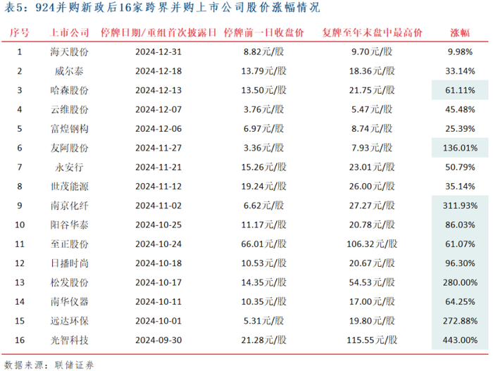 并购重组对于A股行情走势一直是把“双刃剑”,虽然924并购新政后并购热潮渐起,但同时也引发了中小投资者对于跨界重组及借壳概念的不理性炒作问题。据统计,924并购新政后开展跨界并购的16家上市公司,其股价都经历了“井喷式”上涨,从复牌后至2024年年末股价的最高涨幅平均值为125.78%。其中,光智科技、松发股份等涨幅居前。