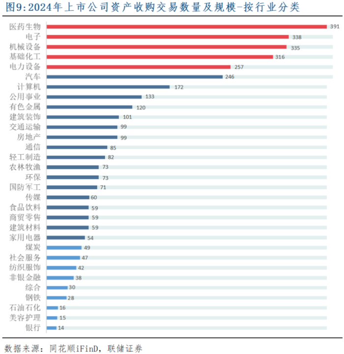 通过分析2024年披露的3,561起资产收购交易所涉上市公司的行业分布情况,发现医药生物、电子、机械设备、基础化工、电力设备、汽车行业的并购活跃度居前,其中医药生物行业2024年发起近400起资产收购交易,占总量约11%,并且已经连续5年蝉联榜首。