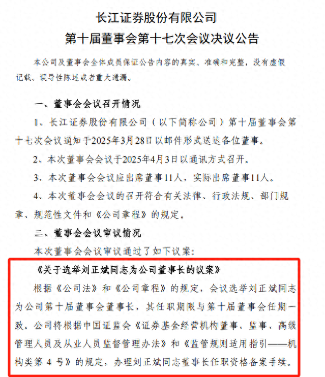 2024年7月,刘正斌正式出任长江证券党委书记;8月,长江证券董事会推选刘正斌为公司第十届董事会董事候选人;9月,刘正斌正式成为长江证券董事会董事;今年3月2日,前任董事长金才玖辞去董事长一职,由刘正斌代为履行董事会相关职责;4月3日,长江证券发布公告,公司董事会选举刘正斌为公司董事长。