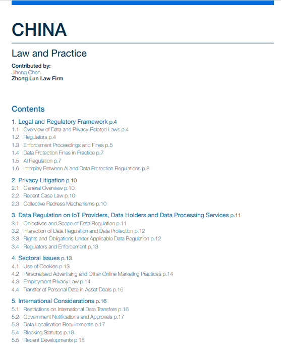 钱伯斯作为国际权威的法律评级机构之一,每年都会出版《钱伯斯全球法律实务指南》,为企业法务提供全球主要法域内核心法律领域的深度法律评论。《指南》关注对商业产生影响的法律实践问题,旨在帮助读者针对不同法域的法律实务问题进行比较研究。受邀参与撰写《指南》的作者均为特定法域与执业领域内专业认可度高、声望领先的律师。作为国内最早涉足数据保护与隐私领域的专业团队之一,中伦积累了为境内外企业提供网络安全与数据保护相关法律服务的丰富经验,一直处于该领域的前沿地位。