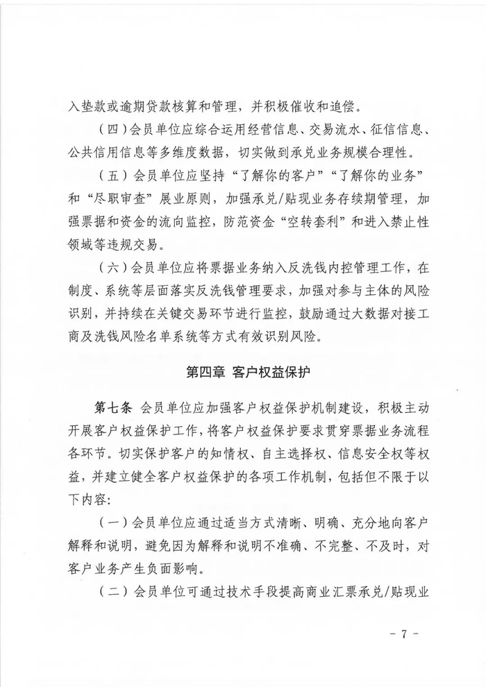 解读:基于风险可控原则,鼓励会员单位对特定政策支持类企业进行交易背景材料制度和规则的简化。分两类来看待此问题,科创、制造业、绿色等企业属于从产业分类层面政策支持,在可切实证明企业属性的前提下,可进行相关简化;在普惠小微企业层面,由于该类企业普遍贴现金额较小,财务人员不专业,易受民间非法贴现误导,相对小额的贴现对银行整体风险进一步降低,因此若可切实证明普惠小微企业的属性,可以,同时应该对该类企业的材料审查要求极简化,引导并促进普惠小微企业在正规银行机构的贴现。
