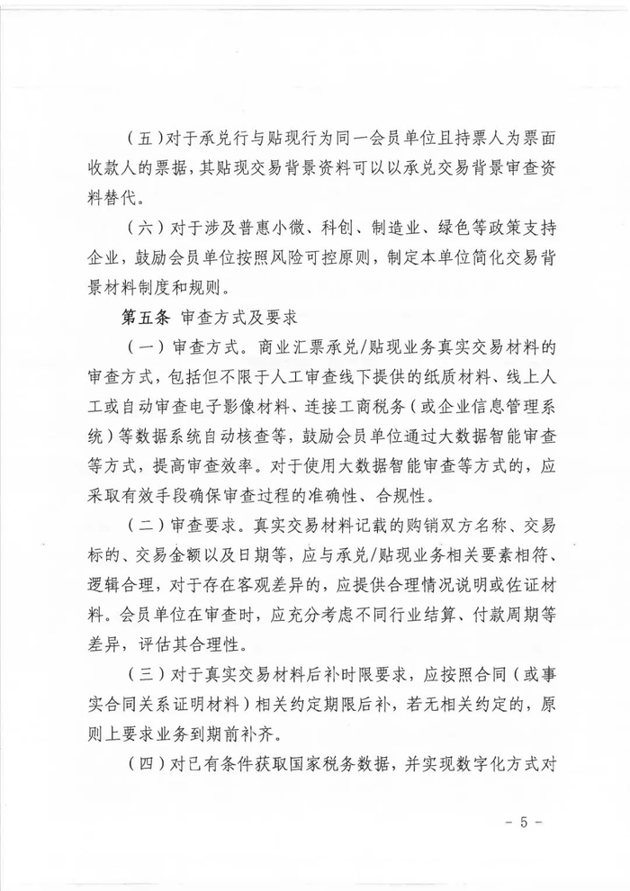 条款:(一)审查方式。商业汇票承兑/贴现业务真实交易材料的审查方式,包括但不限于人工审查线下提供的纸质材料、线上人工或自动审查电子影像材料、连接工商税务(或企业信息管理系统)等数据系统自动核查等,鼓励会员单位通过大数据智能审查等方式,提高审查效率。对于使用大数据智能审查等方式的,应采取有效手段确保审查过程的准确性、合规性。