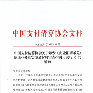 2025年4月2日,中国支付清算协会印发了《商业汇票承兑/贴现业务真实交易材料审查指引(试行)》(简称“《指引》”)的通知,本次出台的《指引》体现了中国支付清算协会推动票据服务实体经济高效发展的坚定决心。现对《指引》核心内容解读如下: