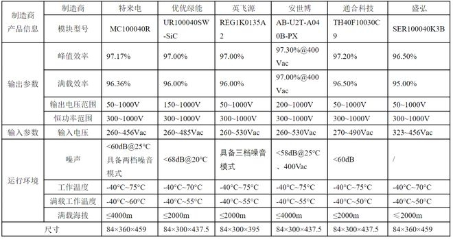 下表所示为业内主流40kW SiC高效充电模块主要参数对比: