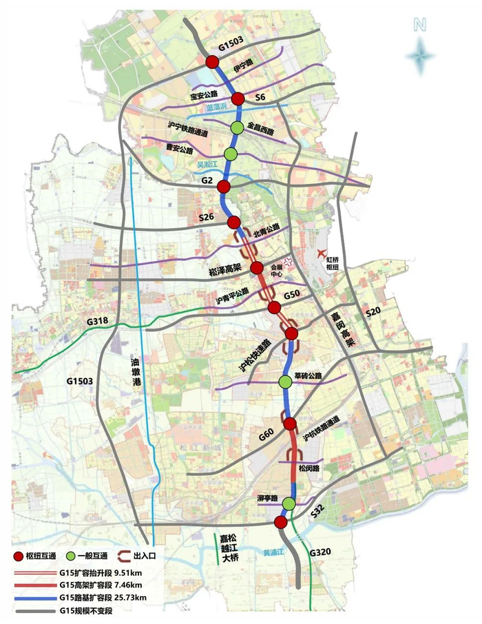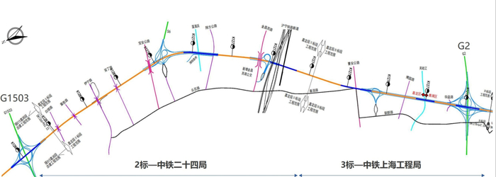 G15公路(沈海高速)嘉金段(G1503公路至S32公路)改扩建工程,北起G15沈海高速和G1503绕城高速立交的南侧,南至S32申嘉湖高速立交,途经嘉定、闵行、青浦、松江4区,全长约42.7公里。其中嘉定段共涉及2标和3标两个标段,总长度约10公里,以路基拓宽和新建集散匝道为主。