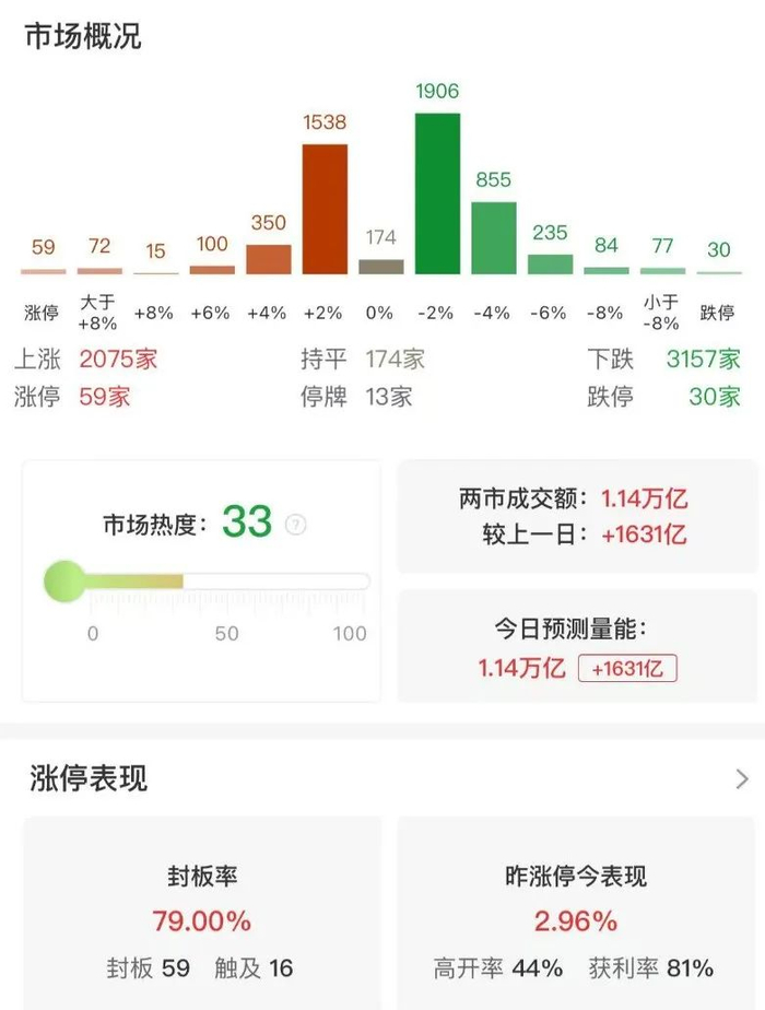 盘面上,市场热点较为杂乱,个股跌多涨少,全市场超3100只个股下跌。 今日共59股涨停,16股封板未遂,封板率为79%,连板股总数9只,跌停30家。 中旗新材、哈三联一字涨停晋级3连板,成为市场高度板;绿色电力板块江苏新能9天5板、立新能源4天3板。