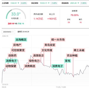 板块方面,中日韩自贸区、兽药、物流、旅游等板块涨幅居前,兽药概念股逆势大涨,金河生物等多股涨停。物流、统一大市场概念股震荡走强,中创物流涨停。大消费股表现活跃,大连圣亚涨停。下跌方面,消费电子、小家电、机器人、PCB等板块跌幅居前。