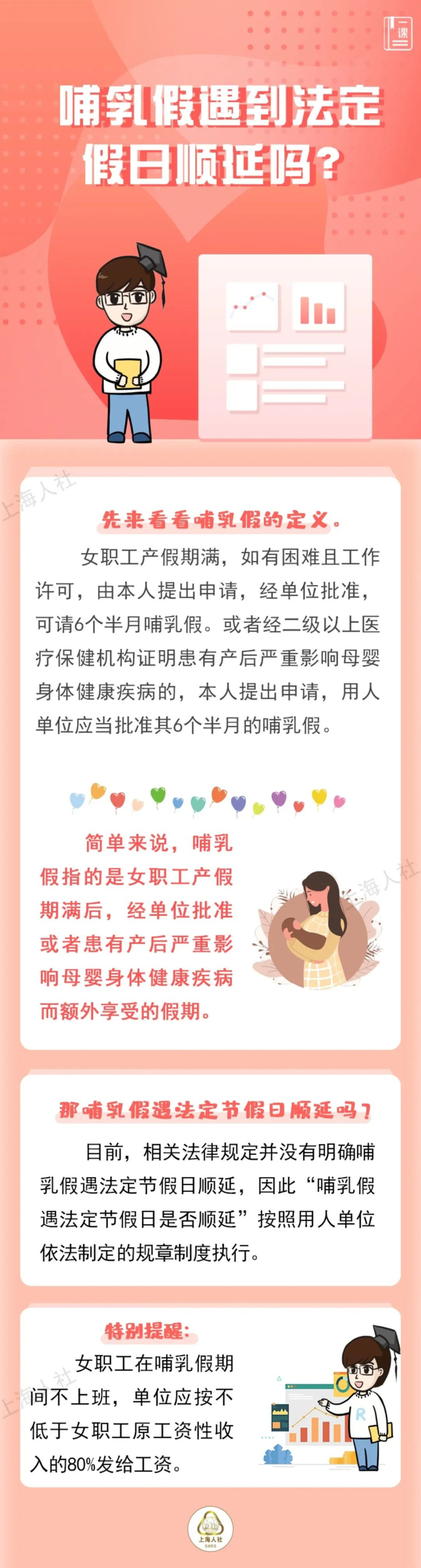 朵朵去年11月1日开始休产假和生育假,下周朵朵的生育假即将结束,最近她向单位提出继续休6个半月哺乳假到今年10月,并附上了医院的证明。经单位批准,朵朵从4月9日开始休哺乳假。那么,哺乳假遇法定节假日会顺延吗?