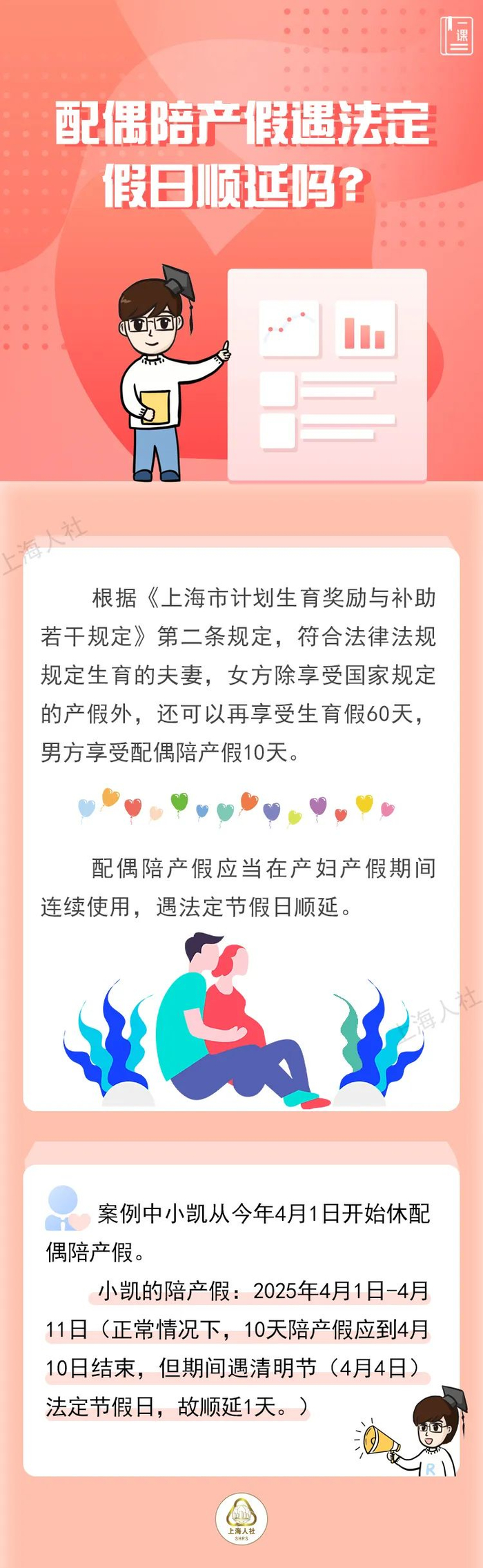 上面我们说到了晓蓉的产假。晓蓉分娩后,她的先生小凯向单位提出从2025年4月1日开始休配偶陪产假。那小凯的陪产假具体又可以休到哪一天?遇法定假日是否顺延呢?