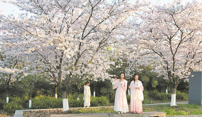 公园内长达2公里的樱花步道被白色花海覆盖,微风拂过时落樱纷飞,场景如梦似幻。不少游客身着汉服或浅色衣裙,借助樱花背景拍出氛围感十足的照片。