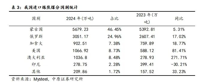 2024年,我国进口炼焦煤1.2亿吨,同比增长19.97%。整体来看,进口炼焦煤格局仍以蒙、俄为主,占总进口量的71.43%。分国别来看,印尼煤进口量同比2023年整体下滑30.21%。进口煤增量最快的为澳煤,同比2023年增长271.71%。自2023年澳煤进口禁令解除以来,我国进口澳煤增长速率加快主要集中在2024年。蒙煤方面,2024年蒙古国整体焦煤出口供货量目标为7600万吨,其中炼焦煤进口量稍有放缓,环比2023年增长280.42万吨。