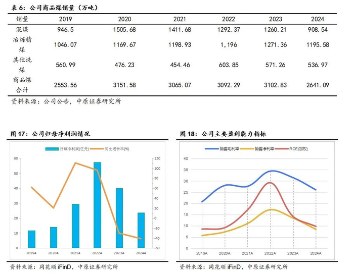 受年初事故等因素影响,2024年公司完成商品煤销量2641万吨,同比减少444万吨。实现营业收入302.81亿元,同比减少4.25%。实现归母净利润23.50亿元,同比减少41.30%。
