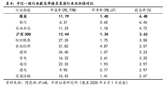 煤炭属于高股息、低估值板块。在中信30个一级行业中,截至2025年4月1日收盘,近12个月股息率排名前五的行业分别为:煤炭、银行、石油石化、纺织服装、食品饮料。