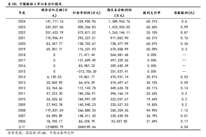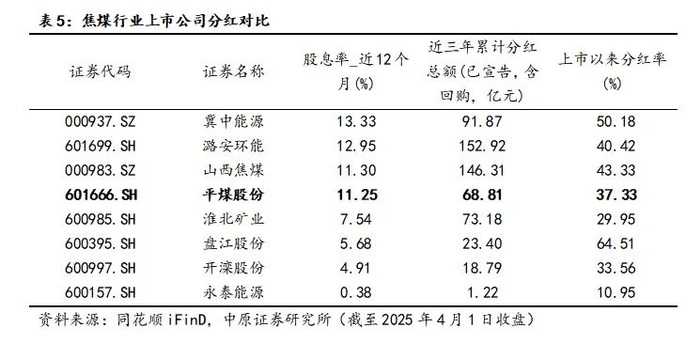 焦煤上市公司股息率水平整体较高。截至2025年4月1日,在8家上市焦煤行业中,平煤股份股息率排名第4,近三年累计分红总额为68.81亿元,上市以来分红率37.33%。