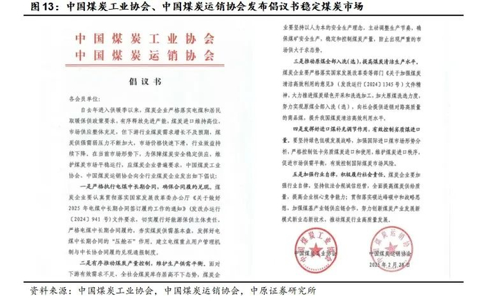 面对煤价下跌,煤炭行业利润持续下滑的不利局面,2025年2月28日,中国煤炭工业协会、中国煤炭运销协会联合发布倡议书。从严格执行电煤中长期合同、有序推动煤炭产量控制、推动原煤全部入洗(选)、发挥好进口煤补充调节作用、加强行业自律等发面提出倡议,以稳定煤炭市场。煤价短期将维持震荡走势,但长期看我国煤炭供需仍面临紧平衡状态,电力需求增长、化工用煤需求增加、建材用煤需求降幅收窄。另一方面,煤矿的开采成本和运输成本上升,及2025年进口煤增速下降,这些因素将对煤价产生支撑。