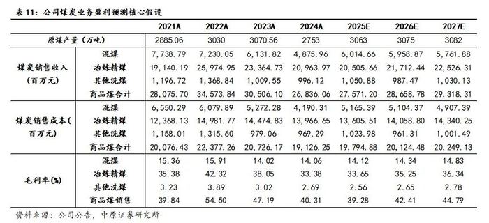 煤碳产量:2024年,公司煤炭产量受年初矿难影响,同比下降10.34%,2025年矿难影响消除,公司煤炭产量将恢复增长。预计2025—2027年公司原煤产量分别为3063/3075/3082万吨。