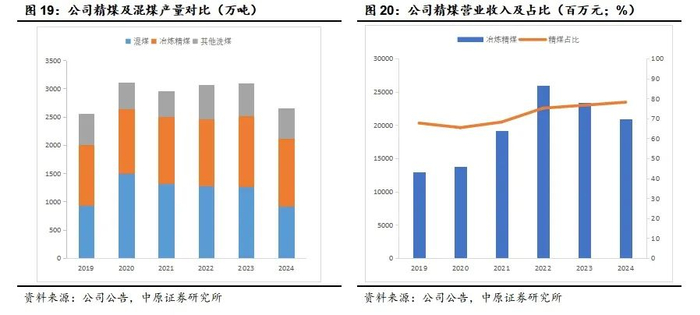 公司精煤战略的核心在于稳步提升精煤的产销量及营收占比。截至2023年末,公司共有4座炼焦煤洗煤厂,洗选能力为2700万吨/年,为精煤战略提供了保障。2019年以来公司冶炼精煤营业收入占比呈现逐步提升的态势。2024年公司调整销售结构,精煤营收占比持续提升,达到78.12%。