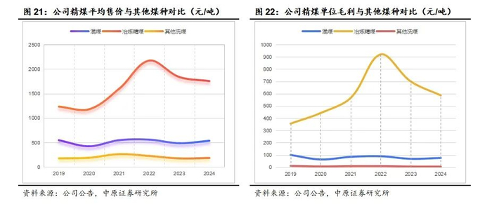 公司精煤战略的核心在于提升精煤的产销量及营收占比。截至2023年末,公司共有4座炼焦煤洗煤厂,洗选能力为2700万吨/年,为精煤战略提供了保障。公司精煤售价及吨毛利高于混煤和其他洗煤,2024年,公司精煤平均售价为1753元/吨,精煤单位毛利达到585元/吨。2019年以来公司冶炼精煤营业收入占比呈现逐步提升的态势。2024年公司调整销售结构,精煤营收占比持续提升,达到78.12%。