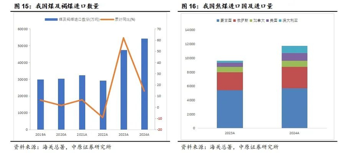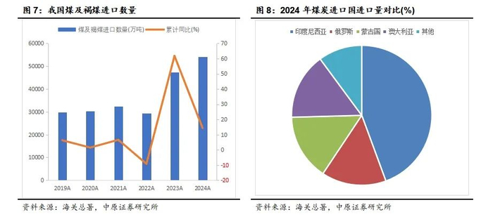2023年起,我国煤炭进口量大幅增长。根据海关总署数据,2023年,我国进口煤炭4.74亿吨,同比增长61.80%。2024年,我国累计进口煤炭5.4亿吨,同比增长14.4%,较2023年61.8%的增幅收窄。从进口国别来看,2024年,我国煤炭进口主要来自印度尼西亚、澳大利亚、蒙古国、俄罗斯,四国合计占比接近90%。煤炭进口的增长一方面增加了我国的煤炭供应,另一方面也对我国煤价产生了冲击。考虑到印尼煤炭2025年存在减产预期,且存在采取限制出口措施;俄罗斯提高煤炭铁路运价后,直接推高煤炭出口成本;而澳大利亚在煤炭产量有所减少的情况下,产量水平已基本接近历史高峰。因此,预计2025年我国煤炭进口量增速将下降。根据海关总署数据,2025年1—2月我国累计进口煤炭7612万吨,同比增长2.1%。