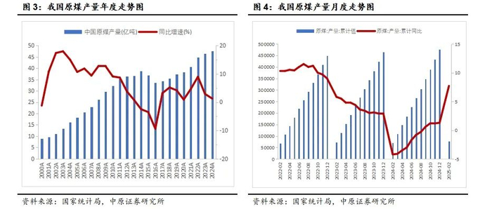 煤炭行业的周期性主要受到宏观经济周期、供需关系、政策调控以及国际市场等多重因素的影响。2001年我国顺利加入WTO,经济实现高速增长。2002年至2012年,我国煤炭行业经历了需求带动产能的“黄金十年”,煤炭价格节节攀升,煤炭产量快速增长,2012年全国煤炭产量达到36.5亿吨,一次能源生产与消费结构中煤炭占比超六成。2013至2015年,由于经济增速放缓,煤炭总需求承压,前期“四万亿计划”刺激下煤炭产能扩张,导致煤炭供大于求,煤价中枢大幅下跌。自2016年起我国煤炭行业大力开展供给侧改革,经历了去产能的阶段,我国原煤产量下降,2016年全国原煤产量33.64亿吨,同比下降9.4%。随着去产能力度持续加大,产能结构不断优化,供需格局得到改善。2020年起,我国煤炭行业进入了新一轮景气度上行周期,年初受疫情影响,煤炭需求下降,煤价下跌,但随着疫情防控取得显著效果,宏观经济稳步恢复增长,煤炭市场需求回暖,煤炭价格逐步回升。特别是在年底,由于冬季供暖需求走强以及澳洲进口煤限制等多重因素叠加,煤炭价格出现快速上涨。2023年我国原煤产量46.58亿吨,同比增长2.9%。2024年我国原煤产量在2023年的高基数水平上增长1.3%至47.6亿吨。2025年前两个月,我国原煤产量7.65亿吨,同比增长7.7%。