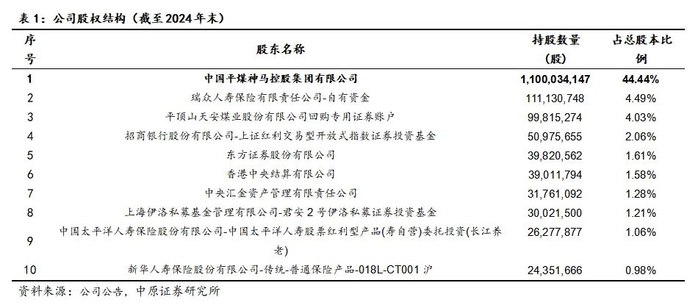 2024年公司控股股东中国平煤神马集团持续增持公司股份,截至2024年12月末,中国平煤神马集团持有公司11.00亿股股份,占比44.44%,较2023年持股占比提升2.99个百分点。