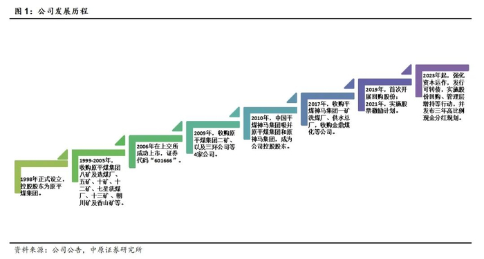 1998年,公司在获得国家经济体制改革委员会批准后正式成立。1999—2005年,公司持续收购控股股东原平煤集团旗下的煤矿资产,并于2006年完成上市,证券代码“601666.SH”。2010年,中国平煤神马集团吸并原平煤集团及神马集团,成为公司新控股股东。2019年,公司首次开展回购股份。2022年起,公司继续加强资本市场运作,发行可转债、权益债等,并全方面开展市值管理,相继实施股份回购、股权激励、管理层增持等行动,发布三年高比例现金分红规划。