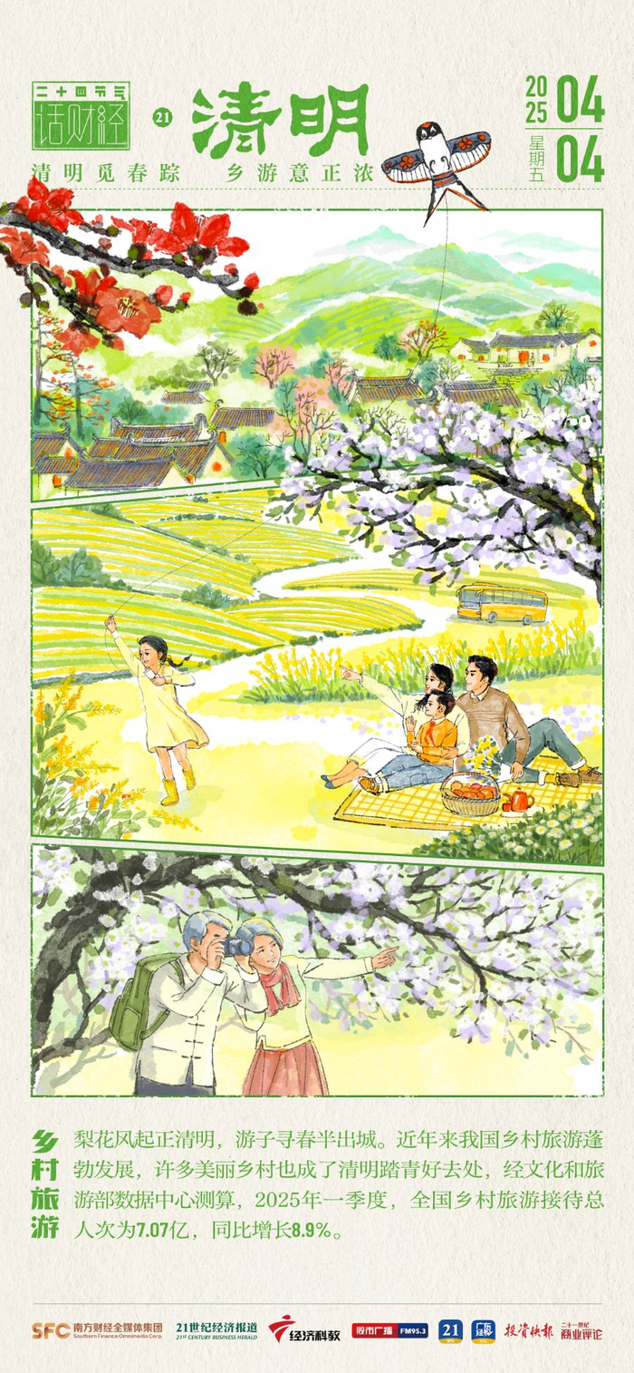 “漠漠翠羽金英,菜花开近清明。”清明之际,春花烂漫,西藏林芝桃花如云似霞、黄山古村落间梯田油菜花次第盛放、贵州平坝万亩樱花铺展山野,缤纷春色成了人们奔赴乡村的理由。据央视新闻报道,综合线上平台数据统计,2025年3月,乡村游产品预订量同比2024年增长52%,“赏花+非遗”类线路热度上涨120%。