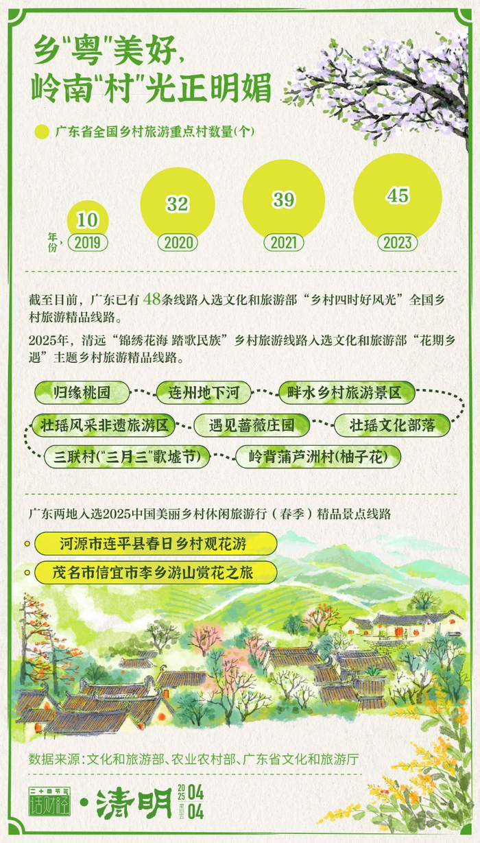亮眼数据背后,离不开得天独厚的自然资源与在地文化的深度挖掘。以广东省今年入选文化和旅游部“花期乡遇”主题乡村旅游精品线路的清远“锦绣花海 踏歌民族”乡村旅游线路为例,该线路既有归缘桃园、连州地下河等景点可赏花赏景赏山水,也能体验壮族“三月三”歌墟节等特色民俗,将田园观光与民俗文化巧妙融合。截至目前,广东省已有48条线路入选文化和旅游部的“乡村四时好风光”全国乡村旅游精品线路。