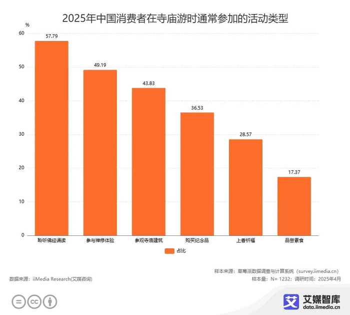 iiMedia Research(艾媒咨询)调研数据显示,在2025年中国消费者在寺庙游时通常参加的活动类型中,57.79%的消费者会选择聆听佛经诵读,49.19%的消费者会选择参与禅修体验。