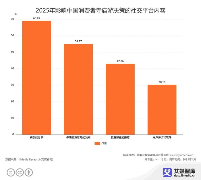 iiMedia Research(艾媒咨询)调研数据显示,2025年消费者寺庙游决策受社交平台内容影响显著。68.99%的消费者受亲友真实体验分享驱动(私域流量转化),54.87%的消费者关注寺庙官方账号的文旅策划(公域权威背书),42.86%的消费者参考旅游博主的内容种草(KOL影响力),仅三成的消费者(30.19%)依赖用户评价与攻略工具(决策辅助依据)。数据折射出年轻群体更倾向“眼见为实”的社交裂变效应,而非标准化评价体系。