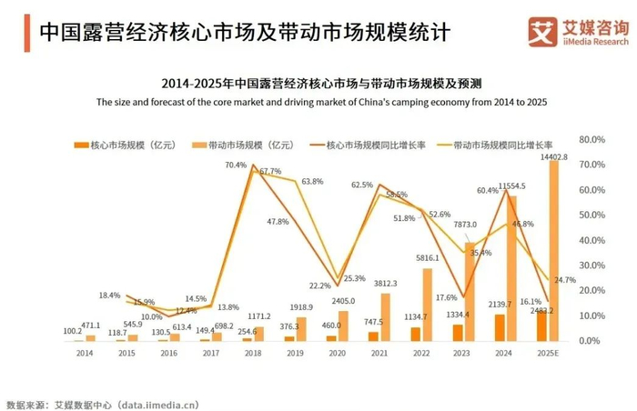 iiMedia Research(艾媒咨询)数据显示,2024年中国露营经济核心市场规模达到2139.7亿元,预计2025年中国露营经济核心市场规模将上升至2483.2亿元,带动市场规模将达到14402.8亿元。