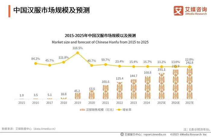 近年来,穿汉服等传统服装游览景点已成为年轻人的一种潮流。恰逢传统时令节日,越来越多的人开始穿汉服并举办相关的文化活动,中国汉服市场规模呈现持续上升扩大趋势。iiMedia Research(艾媒咨询)数据显示,2024年中国汉服市场规模达到168.8亿元,2027年有望达到241.8亿元。