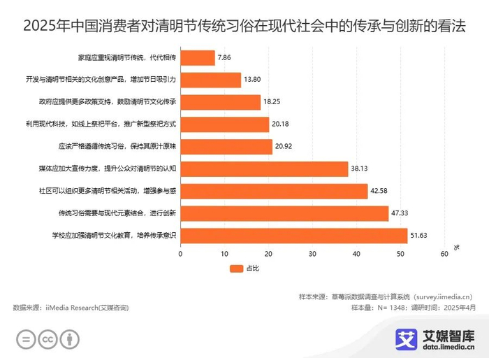 iiMedia Research(艾媒咨询)调研数据显示,针对清明节传统习俗的现代传承与创新,51.63%的消费者认为学校应强化文化教育以筑牢传承根基;47.33%主张通过现代元素融合实现习俗创新表达;另有42.58%建议社区增加主题活动提升参与度。数据表明,消费者既重视传统内核的守护,也期待文化表达的突破,同时呼唤更接地气的实践场景。
