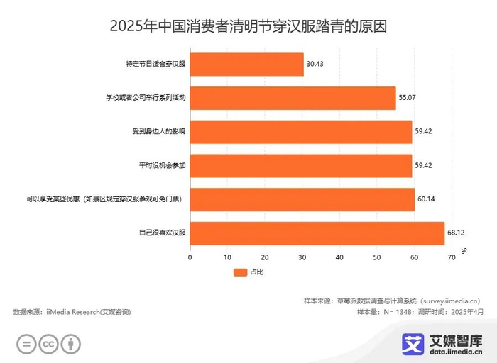 iiMedia Research(艾媒咨询)调研数据显示,2025年清明节期间,70.41%的中国消费者愿意穿汉服踏青。其核心动因在于:出于对汉服文化的深度认同(68.12%),受景区汉服免门票等政策激励(60.14%),另有近六成受访者因日常缺乏体验机会(59.42%)、社交圈层带动(59.42%)及职场/校园主题活动推动(55.07%)而加入这一潮流。