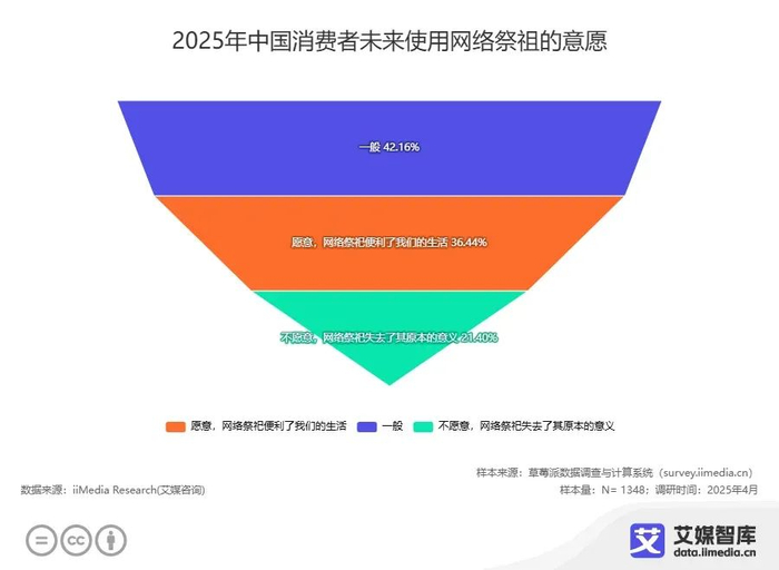 iiMedia Research(艾媒咨询)调研数据显示,有29.97%的消费者体验过网络祭祖,有61.42%表示听说过,但未体验过。关于未来是否使用网络祭祖,36.44%的消费者会选择愿意,处于中立的消费者占比42.16%,21.40%的消费者则认为网络祭祀失去了其原本的意义。