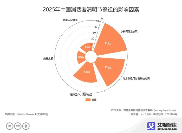 在2025年中国消费者清明节祭祖的影响因素中,出游(49.82%)、祭祖时间存在差异(45.88%)、在外工作,离家较远(32.62%)、扫墓太累(10.04%)、家里人没时间(8.24%)是主要限制原因。