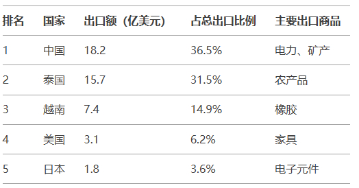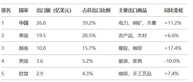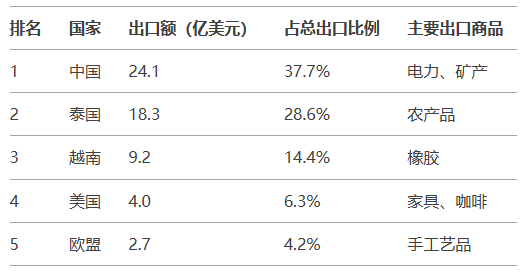 老挝2020-2023年出口目的国TOP 5排名及占比分析