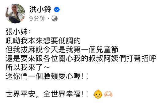 4月4日,中国台湾女星洪小铃晒照透露女儿平安出生,她以女儿“张小妹”口吻发文:“要来跟各位关心我的叔叔阿姨们打声招呼,所以我来了~送你们一个脸颊爱心喔!!”