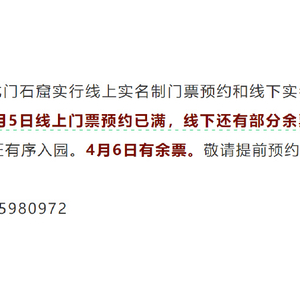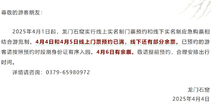 2025年4月1日起,龙门石窟实行线上实名制门票预约和线下实名制应急购票相结合游览制。4月4日和4月5日线上门票预约已满,线下还有部分余票。已预约的游客请按照预约时段刷身份证有序入园。4月6日有余票。敬请提前预约,合理安排出行时间。